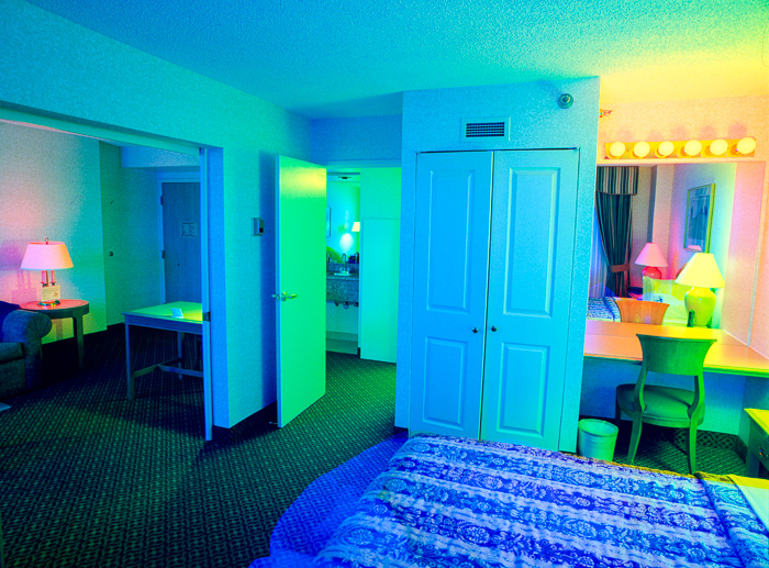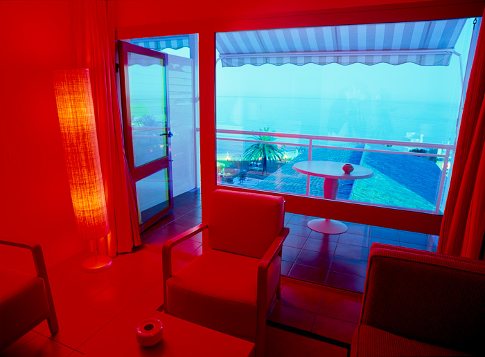 La serie tiene soporte conceptual. Tengo reglas que combinan los elementos del azar en estos ambientes con reglas predeterminadas que proveen parámetros subyacentes para este proceso, Uso una técnica intensiva en tiempo que captura la evolución de la luz y enfatiza el cambio en colores vívidos. Se toman exposiciones múltiples en el curso de 2 o más días y las imágenes son creadas en la cámara on en la película fotográfica sin manipulación digital. Cada imagen está compuesta de 3 a 9 exposiciones. Sólo se utiliza la luz de la habitación para crear las imágenes – no se usan bombillas coloreadas ni geles. Fotografío nada más a horas pre-determinadas del día, y no me permito esperar a que exista la iluminación perfecta; debo ajustarme a una iluminación en particular dadas las restricciones de estos horarios.