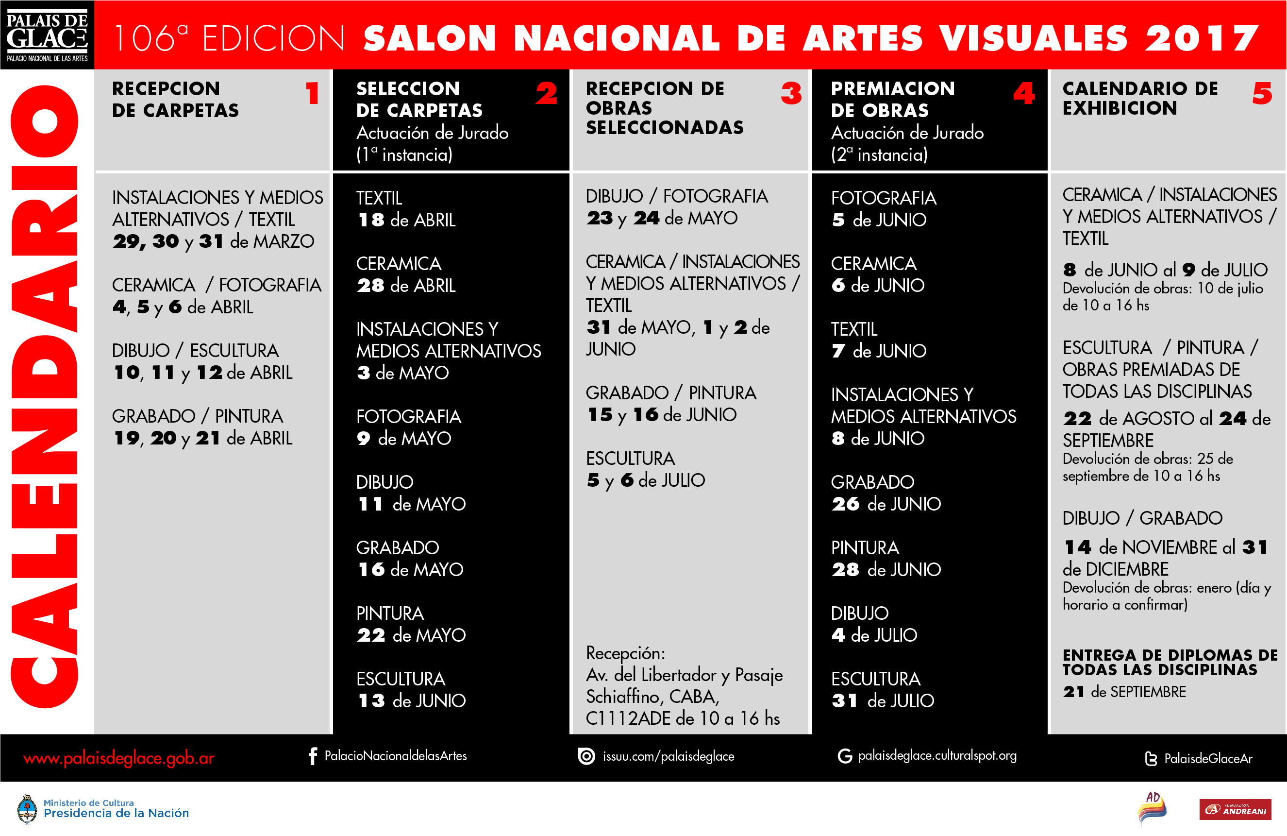 La recepción de carpetas de Instalaciones y medios alternativos/textil será los días 29, 30 y 31 de marzo; mientras que en cerámica y fotografía, el 4, 5 y 6 de abril.